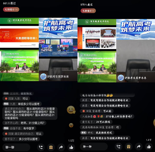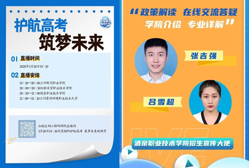 院系动态 > 正文为持续提升人才培养质量,构建优质生源选拔体系,我校于2025年3月19日成功举办“2025年综合评价招生线上宣讲直播活动”。本次活动由招生就业处统筹策划,电子与信息工程学院具体实施,通过“云端对话+全景展示+精准答疑”三位一体模式,搭建了学校与考生、家长之间零距离的沟通交流平台,半小时直播间观看总人数达到了9000与人次,总点赞量八万次,激发了优秀学生报考酒泉学院的积极性和主动性。