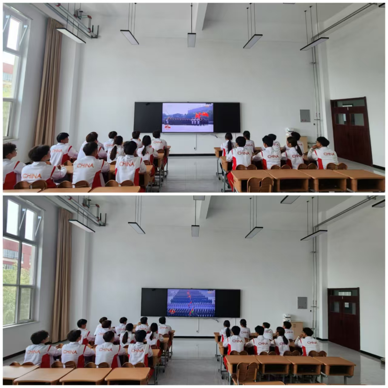 观看过程中,同学们神情专注,情绪高涨。分列式磅礴的气势、战旗方阵呈现的历史厚重感、新型国防力量的集中展示,无不深深触动着每一位在场学生。同学们不仅为人民军队严明的纪律、强大的凝聚力、顽强的精神风貌和祖国的繁荣强盛感到骄傲,更深刻体会到革命先辈血战到底的英雄气概、百折不挠的坚定信念和气壮山河的峥嵘岁月。