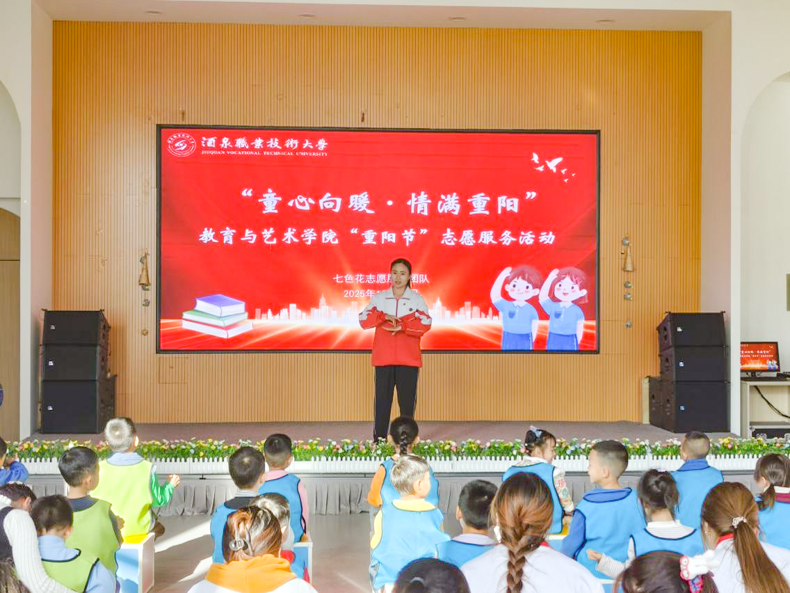 院系动态 > 正文岁岁重阳,今又重阳。为深入弘扬“尊老、敬老、爱老”的中华优秀传统美德,从幼儿阶段播撒感恩的种子,10月31日,教育与艺术学院“七色花”志愿服务团队怀揣热忱之心,带着精心筹备的节目,走进酒泉职业技术大学附属幼儿园,开展“童心向暖・情满重阳”主题志愿服务活动,让传统节日的温情浸润童心,让美德理念扎根幼小心灵。