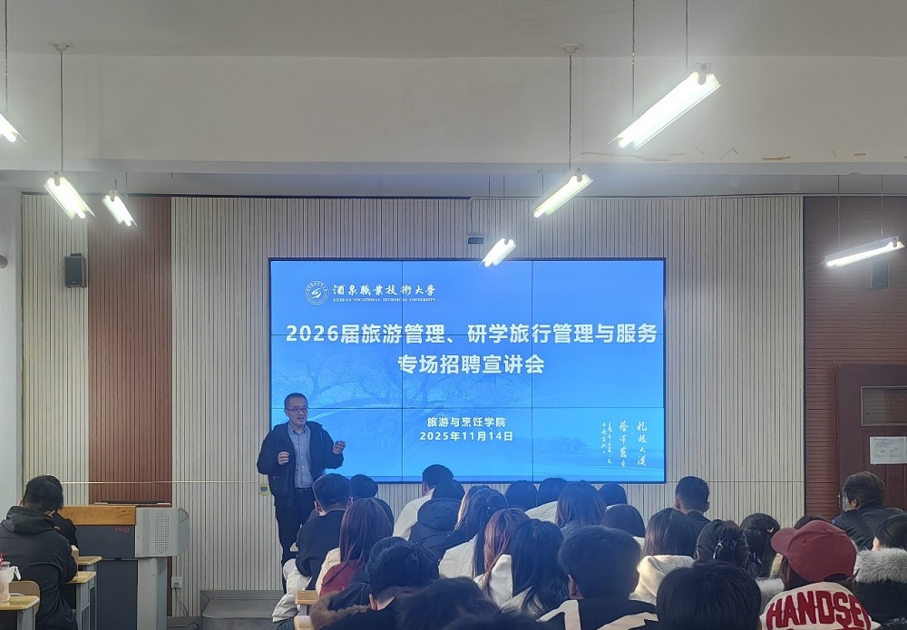 院系动态 > 正文为深化校企合作内涵,精准对接行业需求,拓宽2026届毕业生就业渠道,助力学子实现高质量就业,11月14日,旅游与烹饪学院特邀首都实业投资有限公司招聘经理张庚,为旅游管理、研学旅行管理与服务两个专业举办专场招聘宣讲会。本次宣讲会吸引120余名应届毕业生到场参与,现场互动热烈、咨询踊跃,实现了企业招才与学生求职的双向赋能,取得良好成效。
