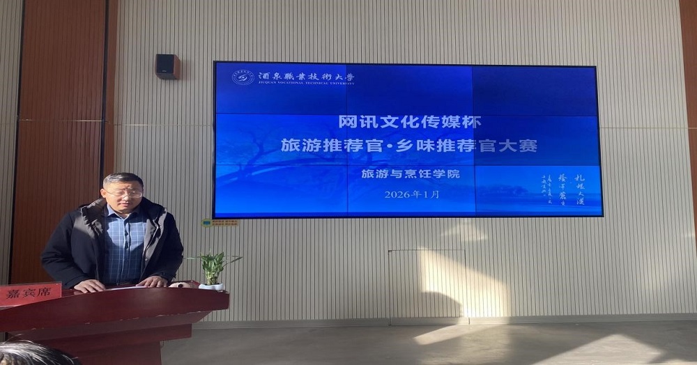 为深化产教融合,激发创新思维,锤炼实践能力,2026年1月6日旅游与烹饪学院举办“网讯文化传媒杯”旅游推荐官·乡味推荐官大赛。本次大赛得到了甘肃网讯文化传媒有限公司董事长刘玮琥先生的大力支持。大赛经过初赛共有十四名选手脱颖而出,在本次决赛中同台竞技,学院党支部副书记、院长刘兴龙、班子成员及旅游管理、研学旅行管理与服务专业的全体教师及2023级旅游管理班、研学旅行管理与服务班的同学观看了本次比赛。