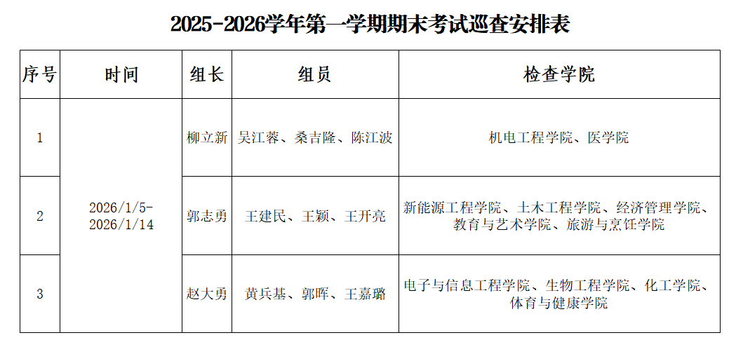 2026年1月5日至12日,教务处组织专项巡查组,对全校期末考试工作进行了全面巡查和督查。巡查工作重点围绕考务组织、考场纪律监考规范等关键环节展开,通过查阅考试安排,督促考试计划落实,深入掌握期末考试组织实施情况。