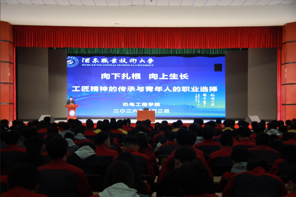 为引导学生树立正确的职业观与成才观,助力学生明确职业方向、锤炼专业技能,4月2日晚,机电工程学院在胡杨文化活动中心成功举办“吉利工匠进校园”主题报告会。宝鸡吉利汽车部件有限公司工匠张晓龙应邀担任主讲嘉宾。学院全体班子成员、2024级全体班主任及560余名2024级学生现场聆听了报告,副院长赵吉虎主持报告会。