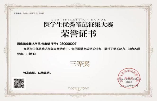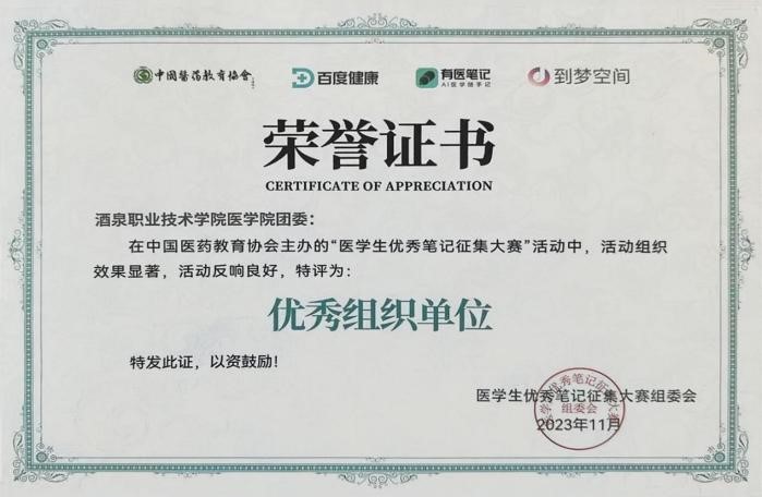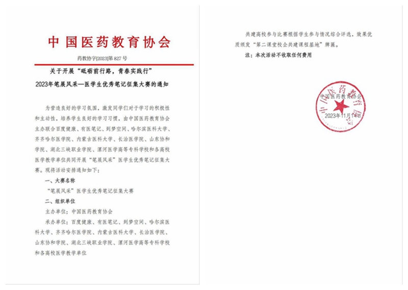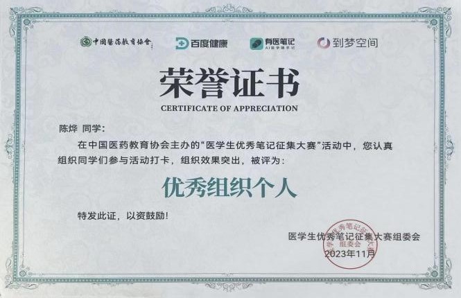 由中国医药教育协会联合百度健康主办的“砥砺前行路,青春实践行”“笔展风采”全国医学生优秀笔记大赛中,医学生学子们以他们的卓越表现,获得“优秀组织奖”、包宏明同学获得三等奖、陈烨同学获得优秀组织个人。