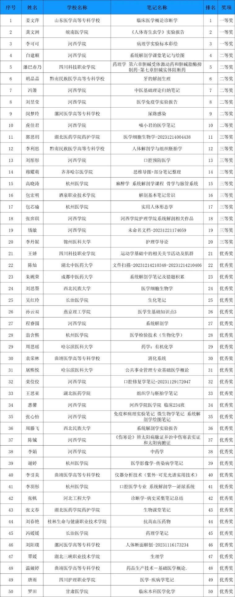本次大赛吸引了来自全国各地的高等专科学校,包括哈尔滨医科大学、齐齐哈尔医学院、长治医学院有医笔记、内蒙古医科大学、山东协和学院、湖北三峡职业学院、漯河医学高等专科学校的积极参与。酒泉职业技术学院的参赛学子们,凭借他们扎实的专业知识、清晰的笔记逻辑和创新的表达方式,在众多选手中脱颖而出,取得了优异的成绩。