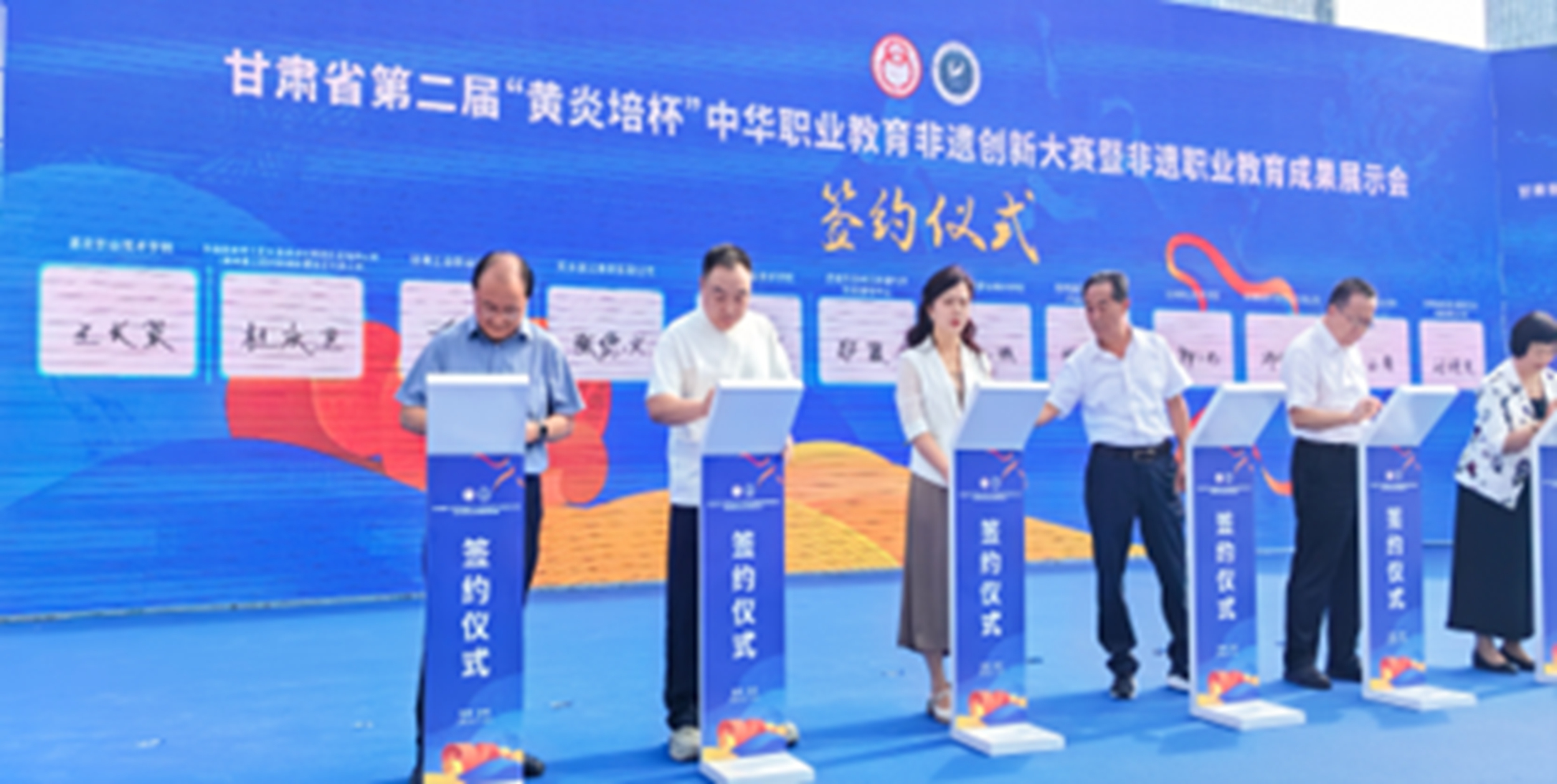 学校党委委员、副校长王长荣带队参加大赛并代表学校与非遗企业进行签约。全省81所院校的240个项目团队和34家非遗工坊、非遗企业参赛、参展。我校参赛的4个项目《再现敦煌--敦煌石粉彩绘技艺传承与创新》荣获一等奖;《墨玉含光•石韵悠长》荣获二等奖;《敦煌神韵--敦煌面塑非遗传承与创新》荣获三等奖;《高职“非遗+”五位一体育人模式实践与探索》荣获非遗教学成果二等奖。