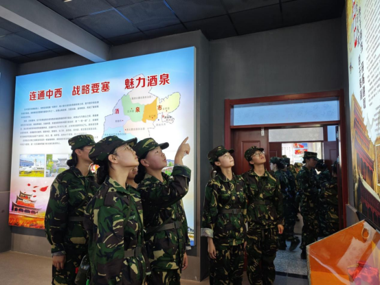 “古今两飞天,新旧两能源”——“览”酒泉历史文化展室。军事训练营学员以营为单位参观了酒泉历史文化展室,讲解员从“航天科技、清洁能源、丰饶物产、战略要塞、历史文化”等方面向学员介绍了酒泉得天独厚的地理条件、资源、风土人情,使学员进一步感受这座国防重镇的历史使命。