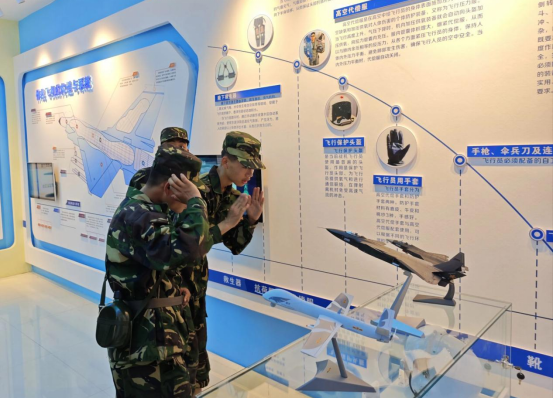 “机穿云海浴蓝天,肝胆忠心卫国全”——“观”空军主题教育展室。空军主题教育展室以图片、实物、模型、等形式,记录了人民空军发展历程、空军部队科技强军、保家卫国的光荣历程,讲解员从“军用飞机浦西”“作战飞机的构造与系统”“飞行员装具”“机械武器”等方面进行讲解,并重点介绍了英模保家卫国的英勇事迹,学员们被丰富的展陈物品所吸引,为中国空军栉风沐雨、开拓创新的精神所震撼、所鼓舞。