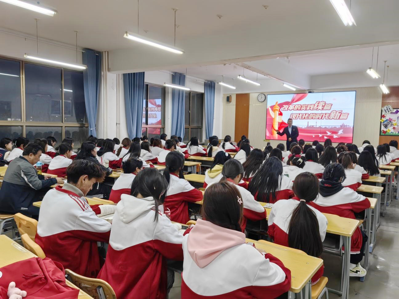 易志军结合时事政治从“把握历史主动,改革波澜壮阔”“锚定关键领域,擘画改革蓝图”“遵循改革规律,保持战略定力”三个方面讲授了“新时代全面深化改革取得的历史性伟大成就”“‘四个迫切需要’的深刻考量”“进一步全面深化改革的目标任务、重大举措”“六条重大原则的丰富内涵”等内容,同学们要充分认识到从“全面深化改革”到“进一步全面深化改革”的历史接续与时代意义,全面把握全面深化改革、推进中国式现代化需要解决的重大体制机制问题、深层次矛盾和问题,把学习成果转化到日常学习生活中去,增强社会责任感和使命感,在推进中国式现代化发展贡献青春力量。