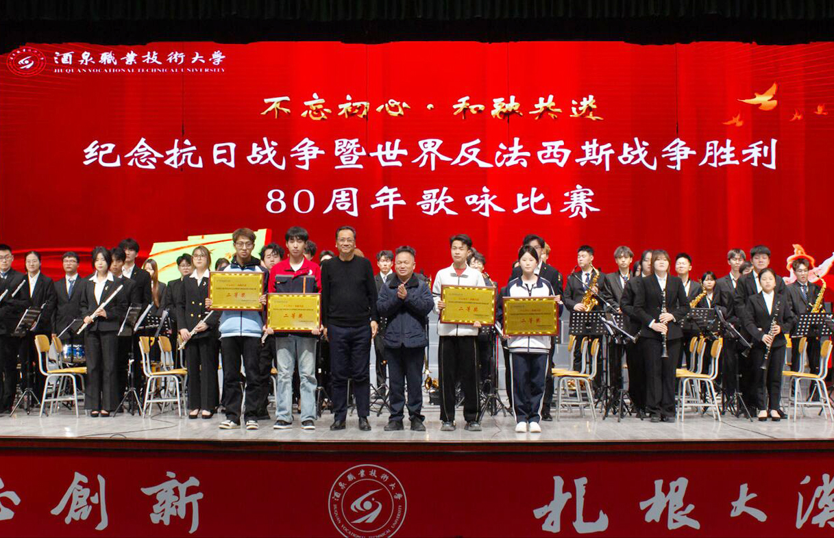 2025年12月9日晚,酒泉职业技术大学胡杨文化活动中心内歌声嘹亮,“不忘初心·和融共进”纪念中国人民抗日战争暨世界反法西斯战争胜利80周年歌咏比赛在此举行。学校党委班子成员、相关职能部门负责人、各学院班子成员以及师生代表齐聚一堂,以青春之声回溯峥嵘岁月,用赤子之心凝聚奋进力量。