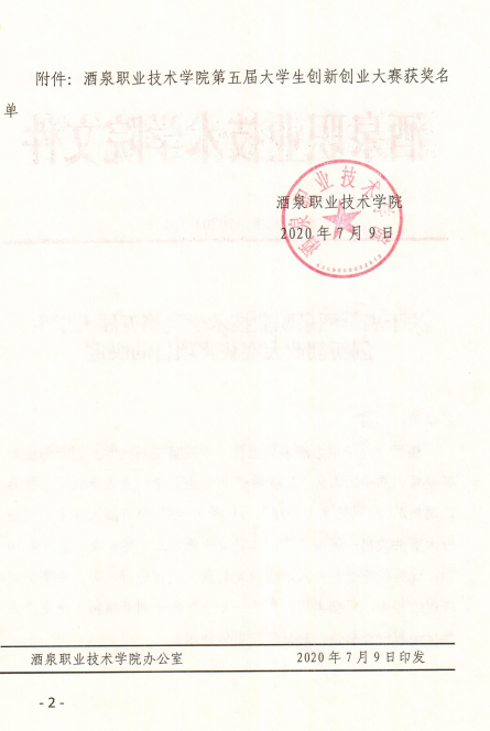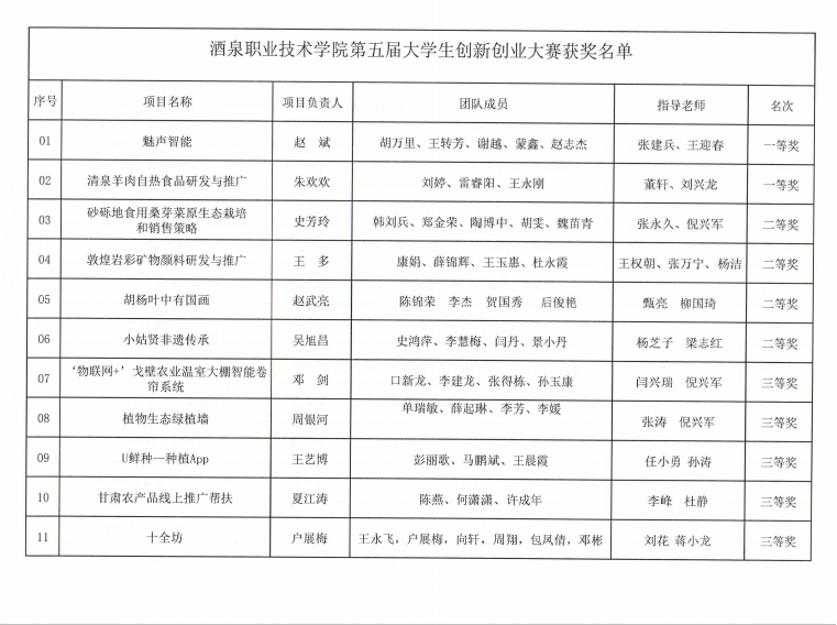 关于表彰酒泉职业技术学院第五届大学生创新创业大赛获奖项目的决定