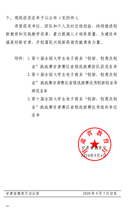 甘肃省教育厅关于公布第十届全国大学生 电子商务“创新、创意及创业”挑战赛 甘肃赛区省级选拔赛获奖名单