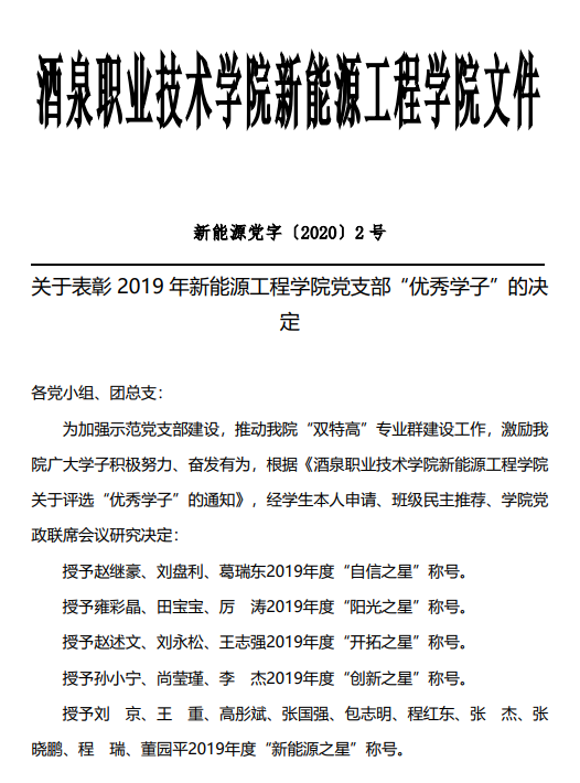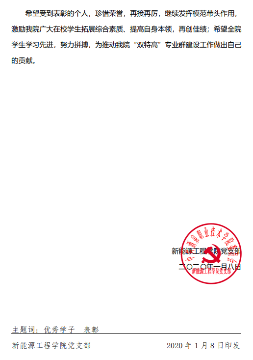 关于表彰2019年度新能源工程学院党支部“优秀学子”的决定