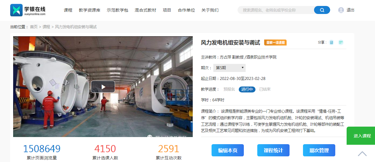 《风力发电机组安装与调试》是风力发电工程技术、新能源装备技术等专业的核心课程,对接“风电机组安装与调试”生产岗位,培育学生具备“知识+技能+思政”的综合职业能力,截至目前,该课程页面累计浏览量超过150万次,累计互动超过2000次,在全国院校、企业职工广泛使用。通过课程建设与应用,有力的推进了专业与产业、生产过程与教学过程等方面的有效对接,下一步将以此获批职业教育国家在线精品课程为契机,深度整合教育教学资源,全面推进教学改革,提高人才培养质量,为社会培养更优质的高素质高技能复合型人才,全面提高学校的办学水平。