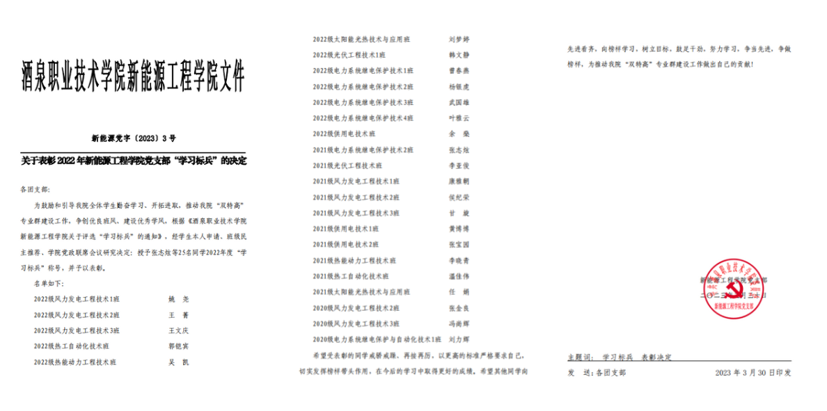 新能源工程学院始终坚持党建引领、团班一体的工作思路,着力打造“先锋•熔志”育人平台,持之以恒促学风、正班风、展新风,不断推动学院创新发展,在履行为党育人、为国育才职责使命和培养有理想、敢担当、能吃苦、肯奋斗的新时代青年学生工作中走在前列、再立新功!