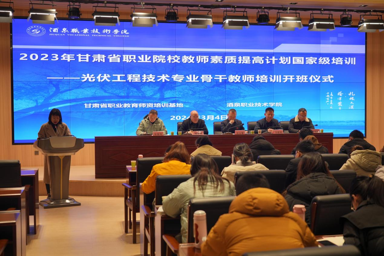 2024年3月4日,由甘肃省教育厅主办、酒泉职业技术学院承办的“2023年甘肃省高等职业院校国家级培训光伏工程技术专业骨干教师培训项目”在我校顺利开班。学校党委委员、副校长王立智,学校党委委员、办公室主任、新能源工程学院党支部书记、院长冯黎成,国际交流学院院长杨春骋,新能源工程学院副院长程明杰等人出席开班仪式,甘肃省10所高职院校共计28位光伏骨干教师参加仪式,本次开班仪式由新能源工程学院副院长张振伟主持。