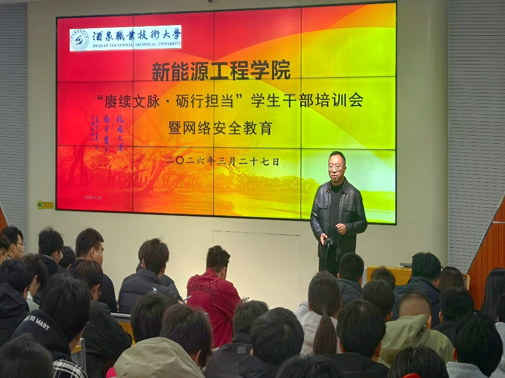 2026年3月27日,新能源工程学院在行知楼阶梯教室召开“先锋·熔志丨赓续文脉·砺行担当”学生干部培训会暨网络安全教育。党支部副书记、院长程明杰作专题培训,学院全体学生干部参加学习。